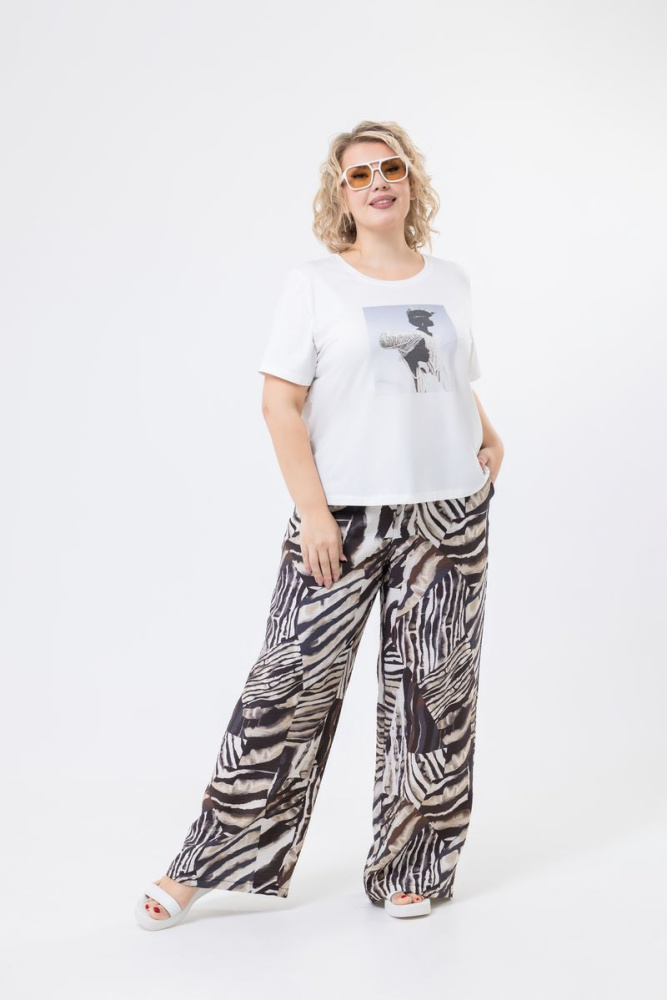 Футболка прямого силуэта выполнена из ткани «Modal». Вырез горловины круглый. Рукав втачной, короткий. По полочке — печать.