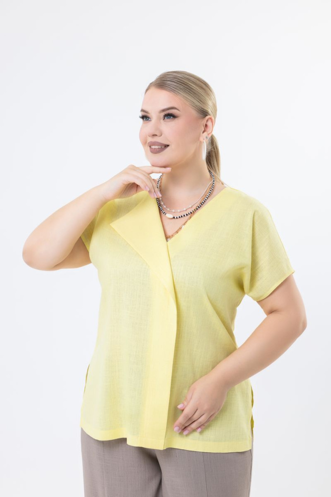 Модель прямого силуэта выполнена из льняной ткани. Вырез горловины V-образный. Цельнокроеный короткий рукав. По центру полочки отлетная планка. По спинке средний шов.