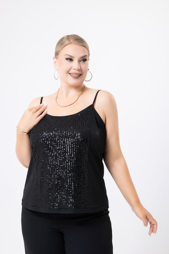 Изделие силуэта трапеция выполнено из масла с блеском. Центр полочки из пайеток. Модель на тонких регулируемых бретелях.