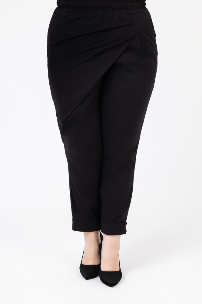 Брюки «Grazy» выполнены из хлопковой ткани Пояс на резинке. Имеются два действующих кармана. В области линии бёдер - драпировка. Низ изделия на манжете.