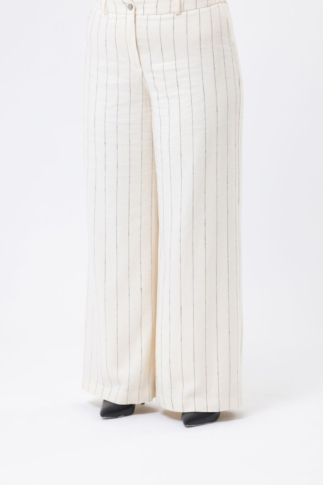 Прямые брюки выполнены из льняной ткани. Пояс по переду фиксированный, по спинке на резинке. Застёжка на молнию и пуговицу. Изделие без карманов. Модель на подкладке.