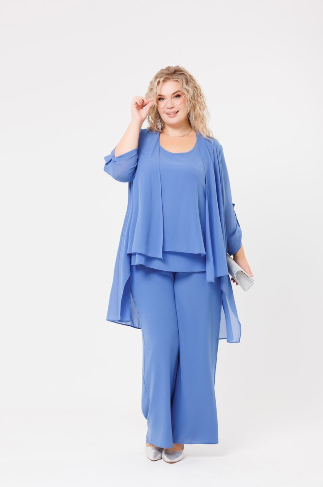 Комплект (кардиган + брюки + топ) выполнен из шифона. Кардиган слегка расклешенного силуэта. Втачной рукав дополнен «патиком» со стразами. Полочки с фигурным низом. Без застёжки. По спинке средний шов.