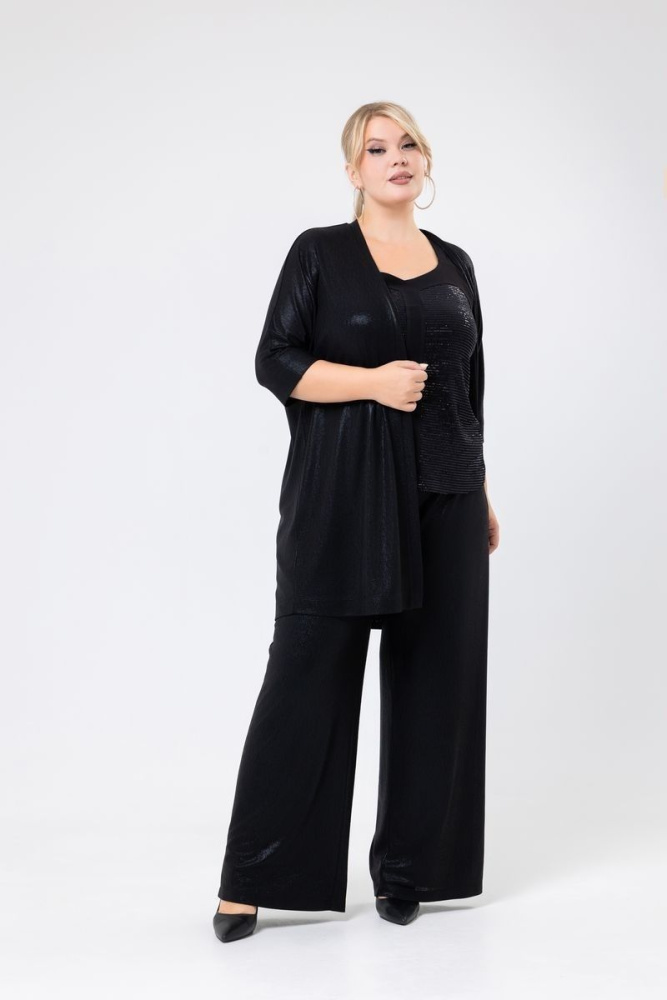 Вырез горловины V- образный. Рукав цельнокроенный, длина за локоть. Модель без подкладки, без пуговиц. К изделию прилагается съемный пояс. Брюки «Трубы» выполнены из вискозы с напылением. Пояс на резинке. Карманов нет. Модель на подкладке.