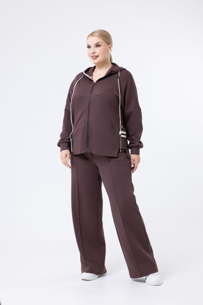 Комплект (бомбер + брюки) выполнен из трикотажного полотна. Бомбер с капюшоном. Спущенная линия плеча. Рукав длинный, на манжете. Застёжка на молнию. В боковых швах — разрезы. Брюки прямые. Пояс на резинке. По передним половинкам — декоративный гульфик. Имеются два действующих кармана.