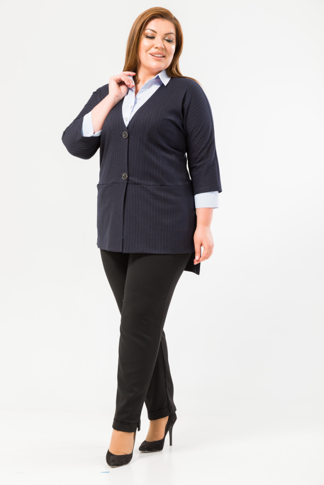 Нижняя часть передних полочек на подкладке. Имеются два кармана.Застёжка на пуговицы. Низ жакета - разноуровневый.