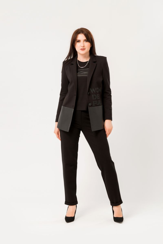 Жакет прямого силуэта выполнен из 2-х видов ткани : трико-таж+ экокожа.Воротник отложной. Рукав втачной, длинный. Имеются 2 действующих кармана. Передние половинки на подкладке.