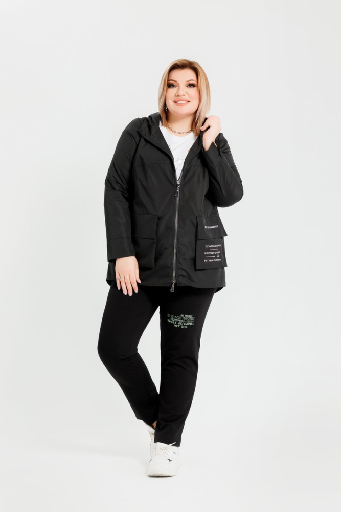 Изделие с капюшоном выполнено из плащёвки. Рукав втачной длинный, на манжете. По переду два отлетных дейст вующих кармана. По центру застёжка на молнию. По спинке дизайнерский печатный принт. Длина изделия разноуровневая.
