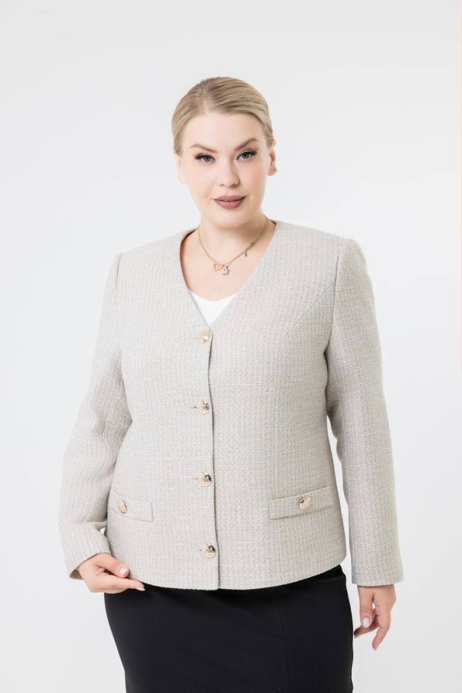 Модель выполнена из ткани твид с люрексовой нитью. Вырез горловины V-образный. Рукава втачные, длинные. По полочке листочки и центральная застёжка на пуговицы. Изделие на подкладке.