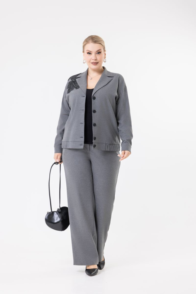 Модель прямого силуэта выполнена из костюмной ткани. Отложной воротник с лацканами. Спущенная линия плеча. Рукав длинный, на манжете. По полочке аппликация и действующие карманы. Без подкладки.
