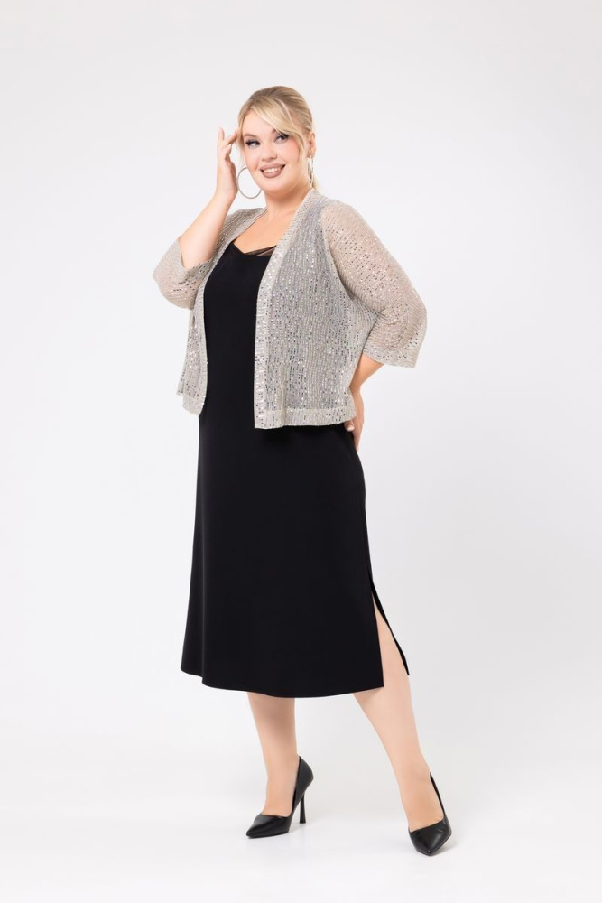 Платье прямого силуэта, выполнено из ткани «Versace». Округлый вырез горловины дополнен вставкой из сетки. В боковом шве разрез. По спинке средний шов.
