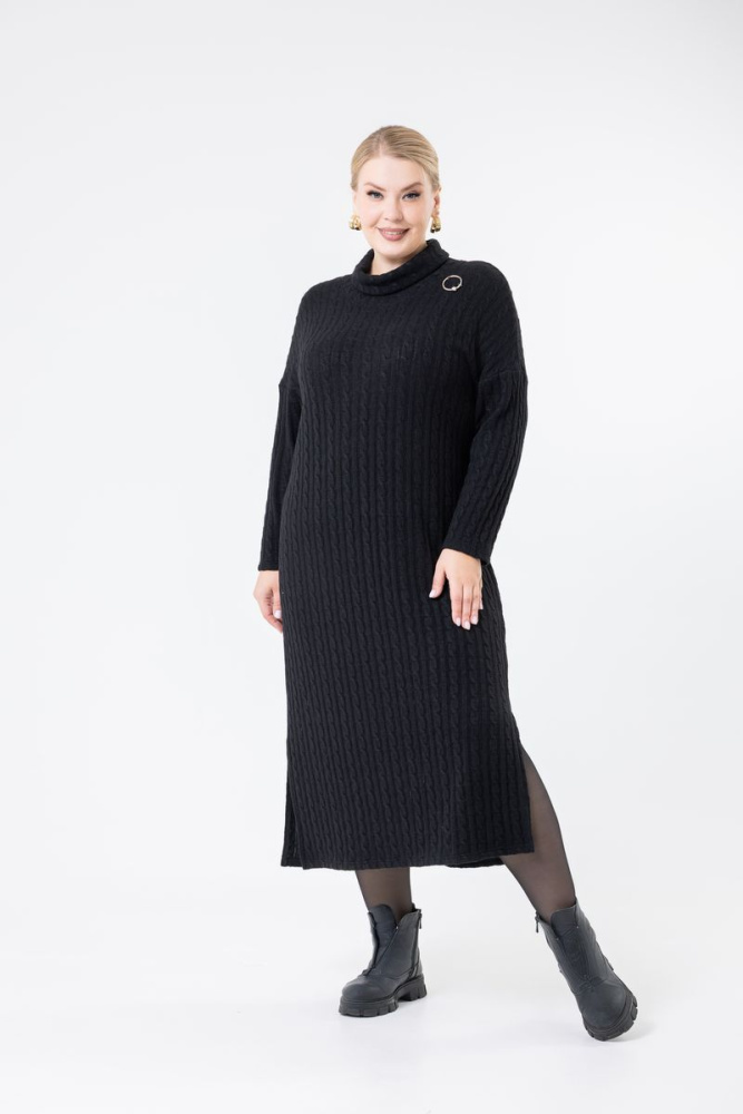 Длинное прямое платье выполнено из трикотажного вязаного полотна («Косичка»). Спущенная линия плеча. Рукав длинный. В боковых швах внизу разрезы. Изделие дополнено украшением (кольцо с глазком).