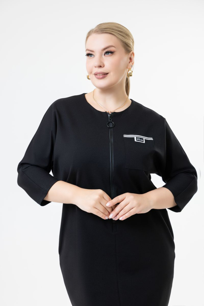 Платье прямого силуэта выполнено из трикотажного полотна. Круглый вырез горловины. Цельнокроеный рукав. По центру изделия действующая молния. По полочке (в верхней части) карман. В боковых швах два действующих кармана.