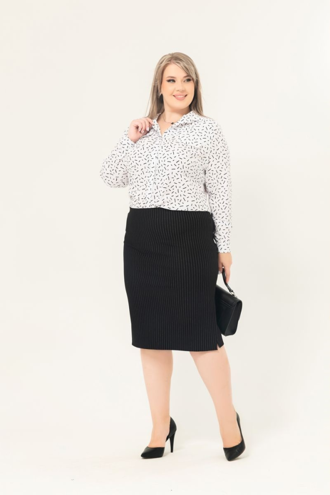 Модель, зауженная книзу, выполнена из трикотажного полотна. Пояс на обтачке на широкой эластичной резинке. С боку шлица. Изделие на подкладке.