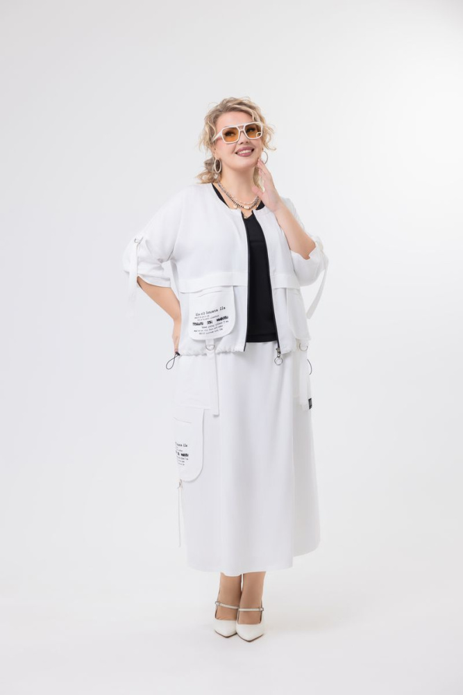 Юбка силуэта «трапеция» выполнена из ткани «Belmando». Пояс на резинке. Имеются три действующих кармана. Изделие на подкладке.