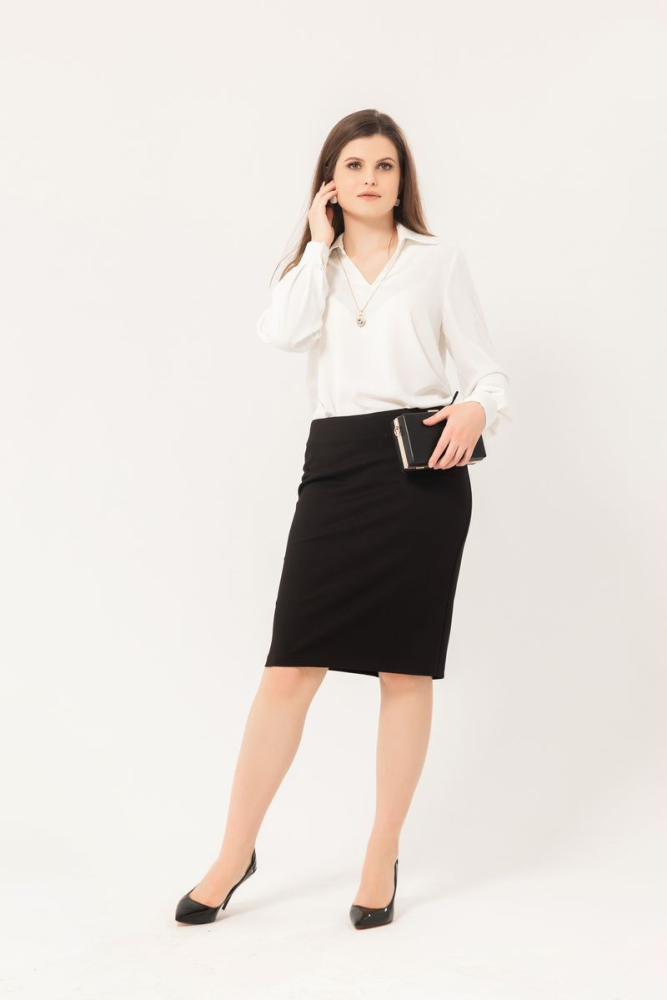Блузон свободного силуэта выполнен из ткани "Падия". Отложной воротник с V-образным вырезом горловины. Рукав втачной, длинный, на манжете. Длина изделия разноуровневая.