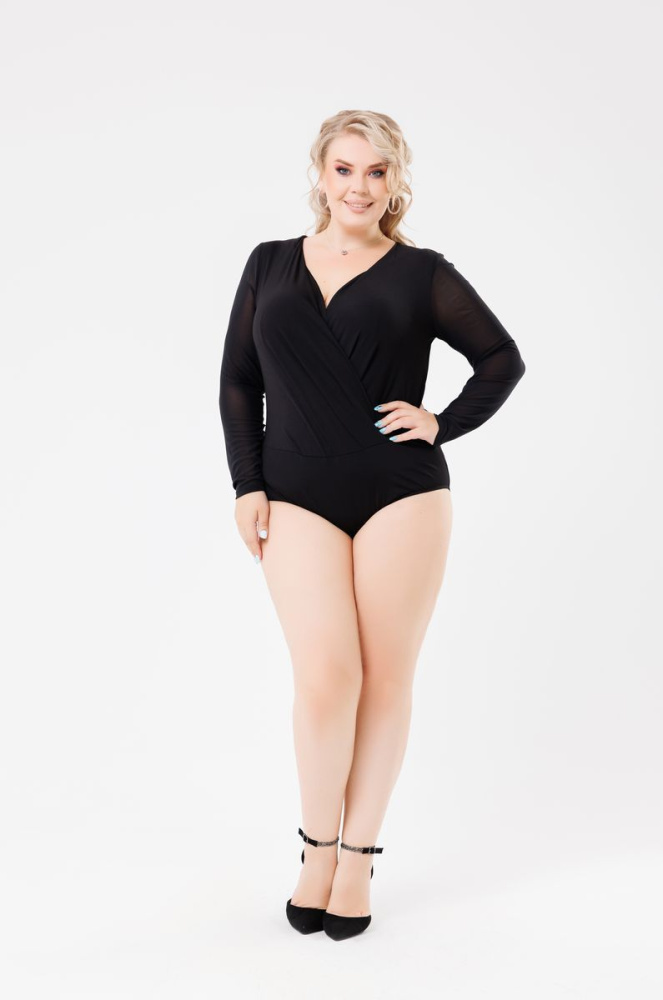 Боди выполнено из французского полотна. V- образный вырез горловины, переходящий в запАх. Рукава втачные, длинные выполнены из сетки.