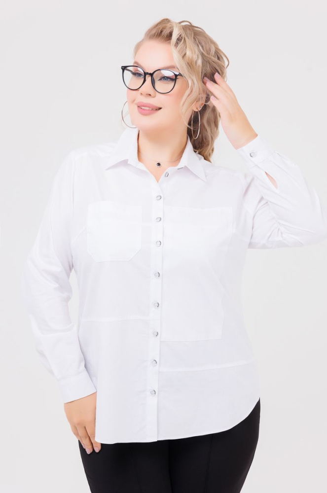 Модель прямого силуэта выполнена из хлопка. Отложной воротник. Рукав втачной, длинный, на манжете. По полочке накладной карман и застёжка н пуговицы. По спинке «кокетка» и складка. По боковым швам фигурные разрезы.