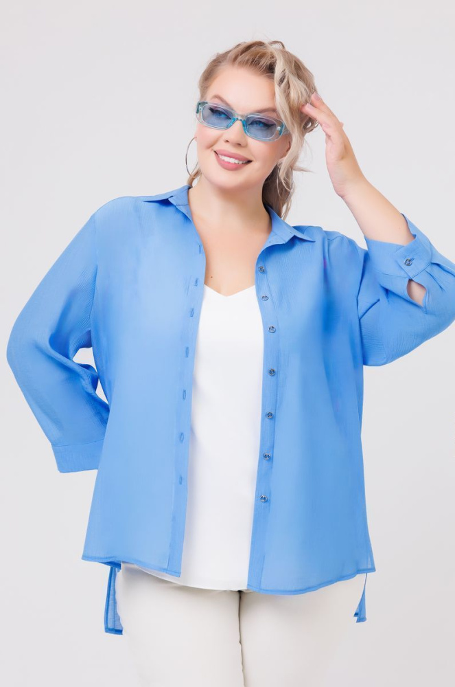 Изделие свободного силуэта выполнено из ткани «Грейс», с лёгким эффектом крэш. Воротник рубашечного типа. Рукав втачной, длинный, на манжете.