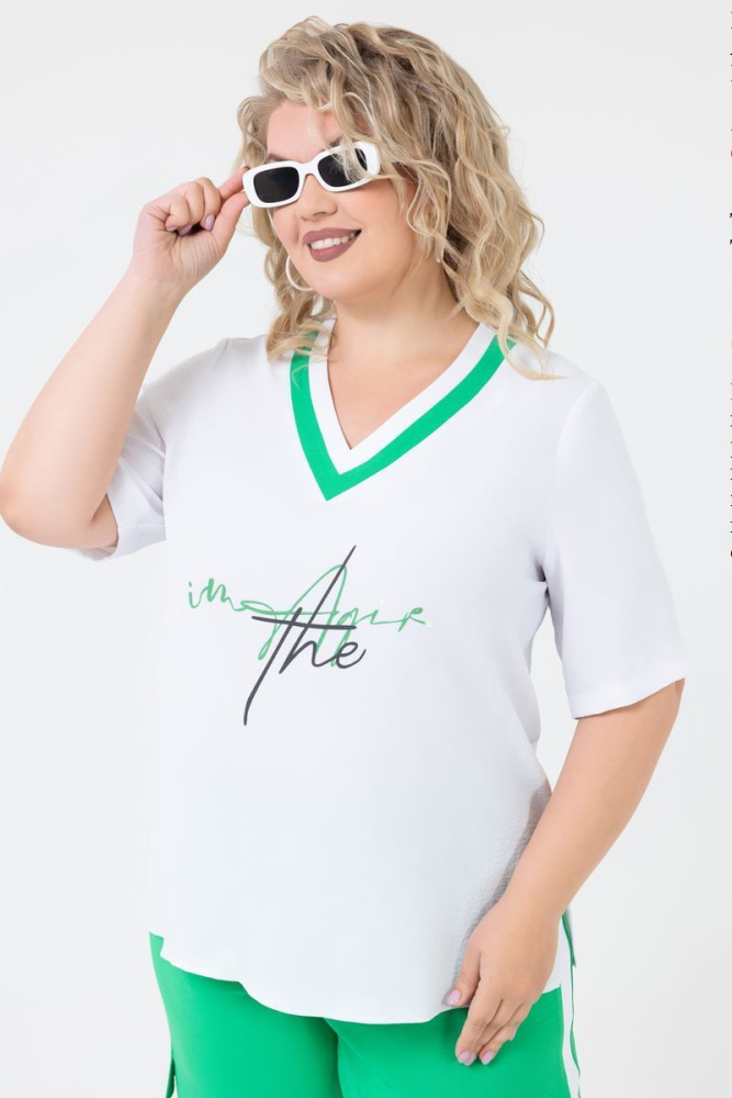 Изделие свободного силуэта выполнено из ткани «Манго». Вырез горловины V - образный. Ру кавтачной, длина до локтя. По центру полочки - печать. В боковых швах - разрезы. По спинке средний шов.