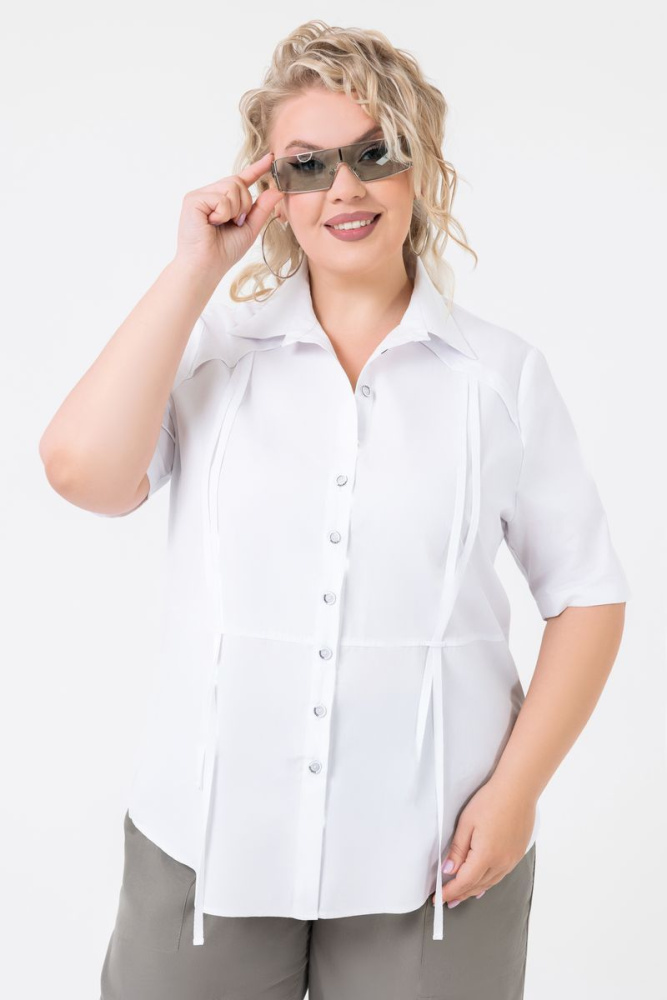 Рубашка свободного силуэта выполнена из хлопка. Отложной воротник. Втачные рукава, длина выше локтя. По полочке «кокетка» и отлетные декоративные шнурки. По центру застежка на пуговицы. В боковых швах - разрезы.