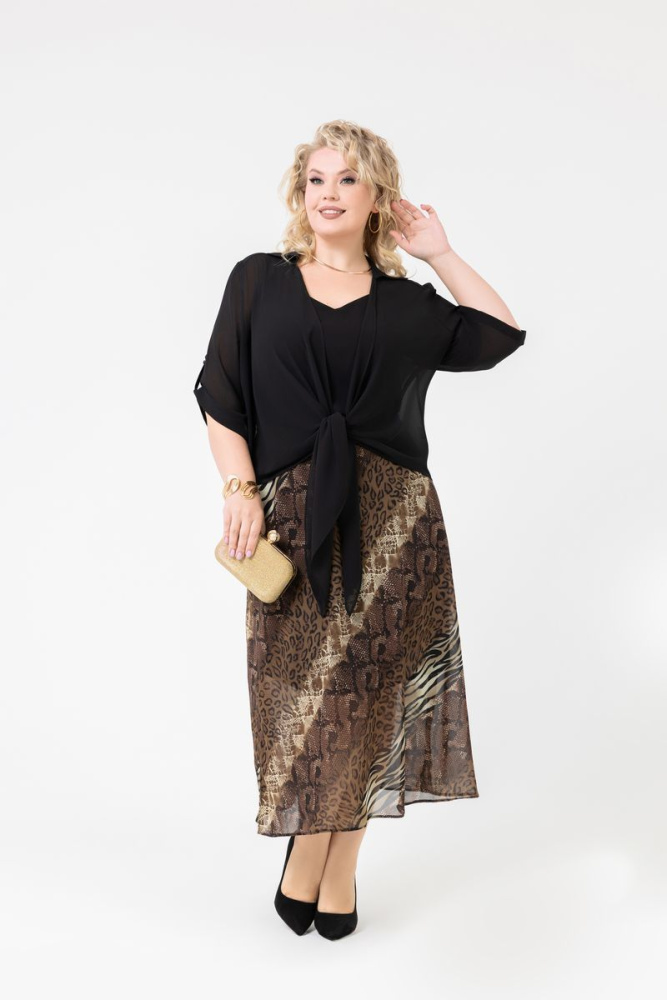 Модель свободного силуэта выполнена из шифона. Воротник отложной Рукав втачной с «патиком» Длина ниже локтя. По переду и спинке - «кокетка».