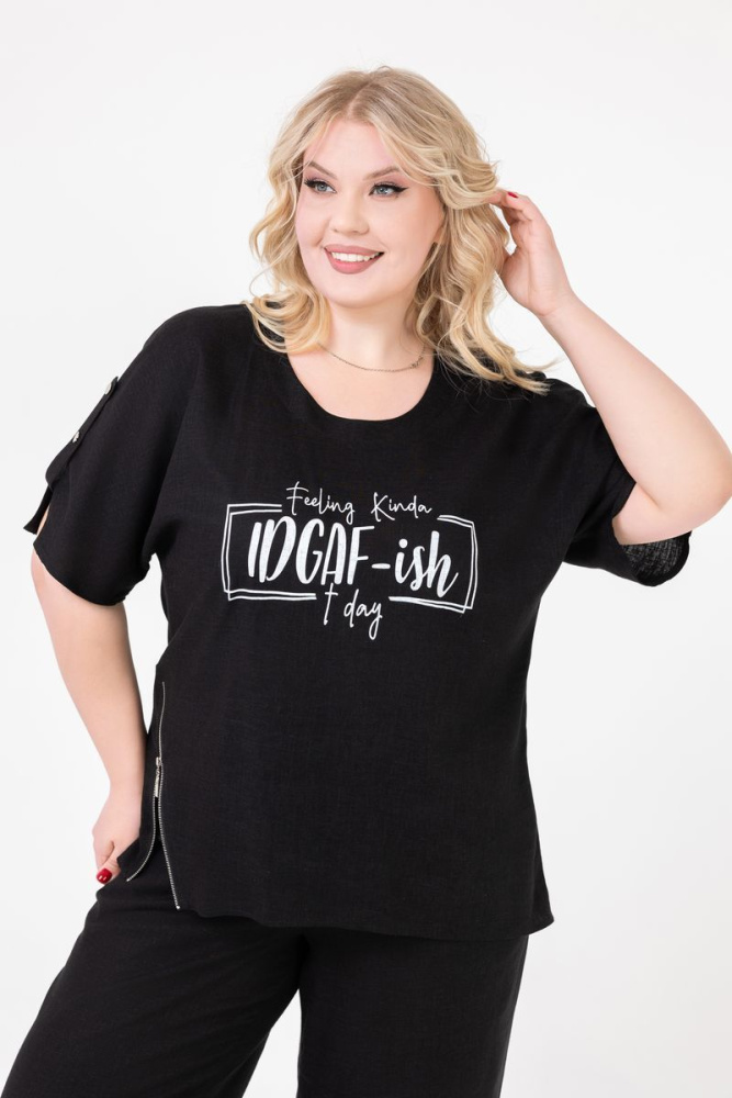 Туника полуприлегающего силуэта выполнена из льняной ткани Вырез горловины круглый Цельнокроеный рукав с декоративной планкой и пуговицами Длина за локоть. По центру полочки — печать. С правой стороны полочки, внизу, молния. Низ изделия разноуровневый - полочка короче спинки.