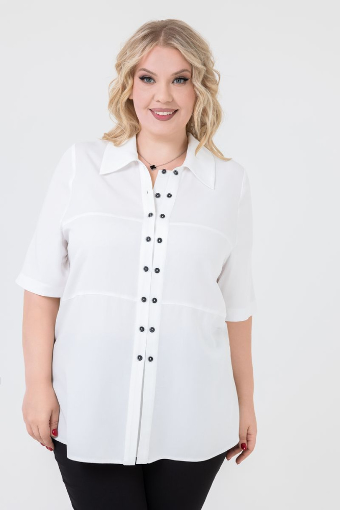 Рубашка прямого силуэта выполнена из ткани «Веlmando». Отложной воротник. Рукав втачной. Длина за локоть. По центру полочки двойная планка Застёжка на пуговицы В боковых швах разрезы.