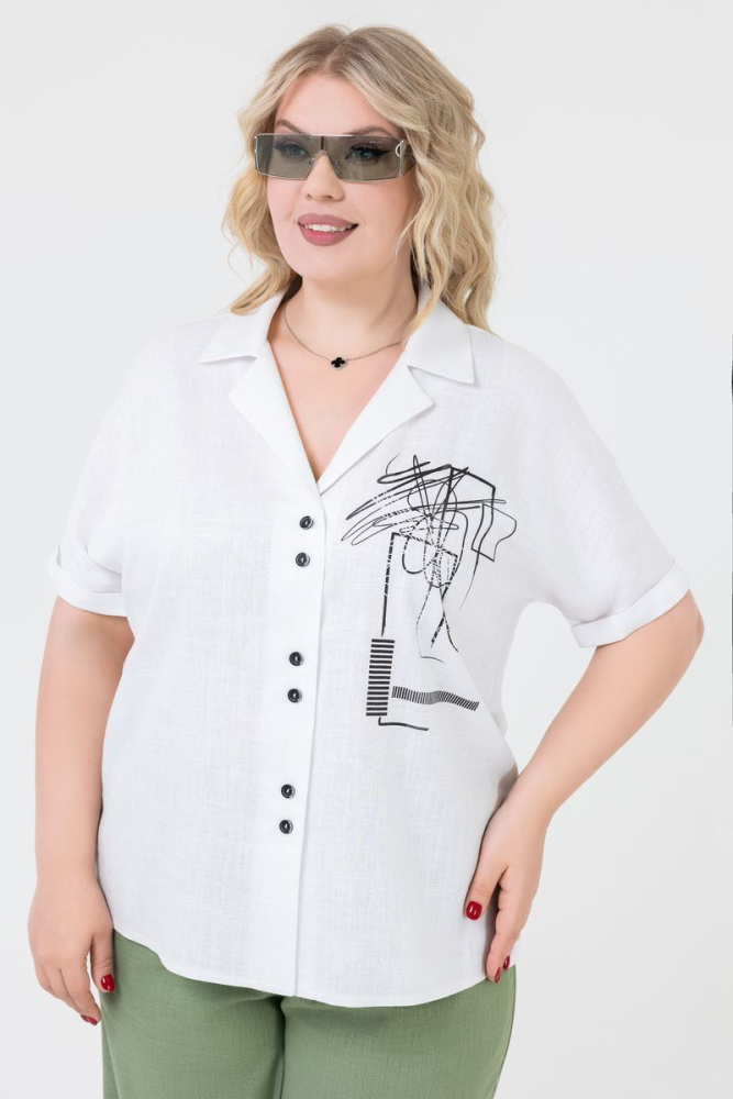 Отложной воротник с небольшими лацканами. Рукав цельнокроеный, на манжете По центру изделия застёжка на пуговицы. По полочке — печать.