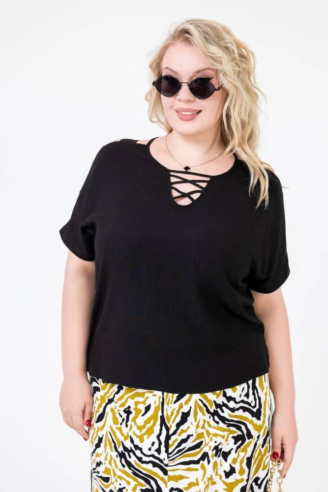 Блузка прямого силуэта выполнена из ткани «Родер». Вырез горловины круглый Слегка спущенная линия плеча Рукав цельнокроеный. Длина до локтя В боковых швах разрезы.
