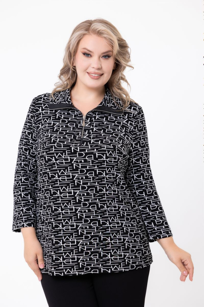 Модель полуприлегающего силуэта выполнена из трикотажного полотна. Воротник — отложной. Рукав втачной, длинный. По центру, в верхней части изделия, застёжка на молнию. В боковых швах, внизу, небольшие разрезы.