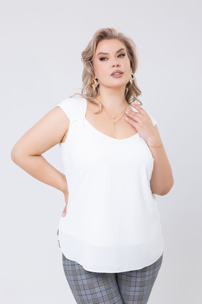 Топ прямого силуэта выполнен из ткани « Bali». Полочка выполнена из двойного слоя ткани. Фигурный вырез горловины. В боковых швах, внизу, закруглённые разрезы.