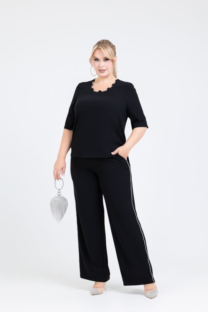 Модель полуприлегающего силуэта выполнена из плательного крепа. Вырез горловины крулый,продекорирован декоративным шнуром. Рукав втачной. Длина до локтя. В боковых швах, внизу, разрезы. Разноуровневая длина: полочка короче спинки.