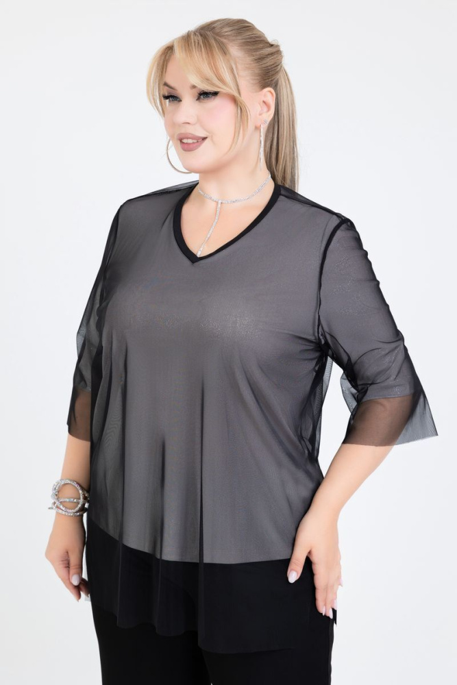 Двухслойная блуза выполнена из двух видов ткани: сетка + трикотажное полотно с блеском. V- образный вырез горловины. Рукава втачные. Длина за локоть. Сетка закреплена по горловине.