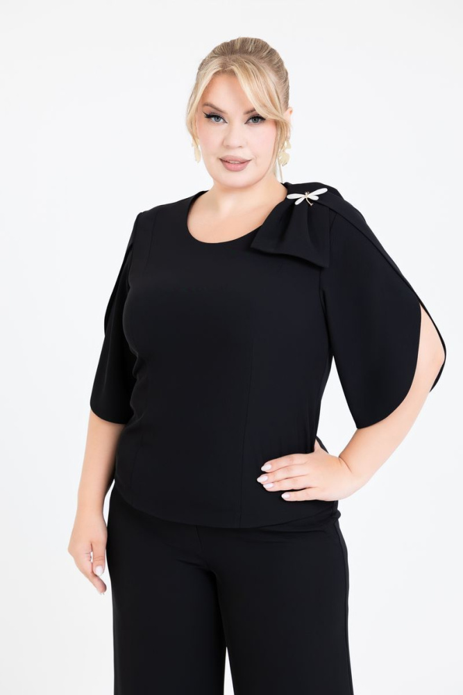 Блуза полуприлегающего силуэта выполнена из ткани “Versace”. Вырез горловины круглый.Дизайнерский рукав. По плечевому шву декоративный бант и брошь. По полочке рельефы. По спинке серединный шов и молния.