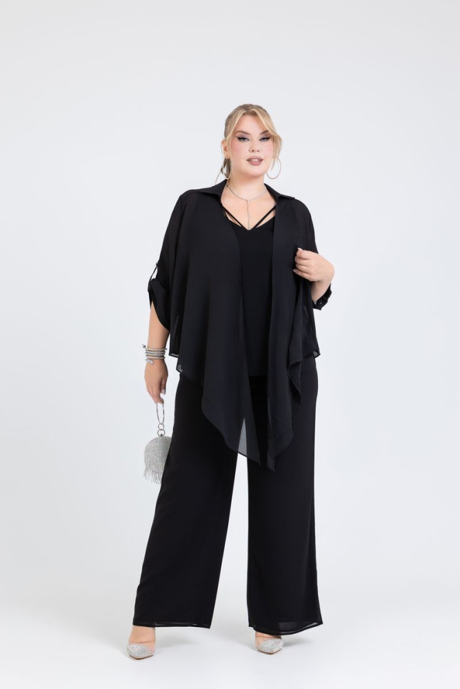 Модель прямого силуэта выполнена из шифона. Рукав втачной с «патиком», длина ниже локтя. По спинке «кокетка» и термоаппликация из страз «AMORE». Изделие без застёжки.