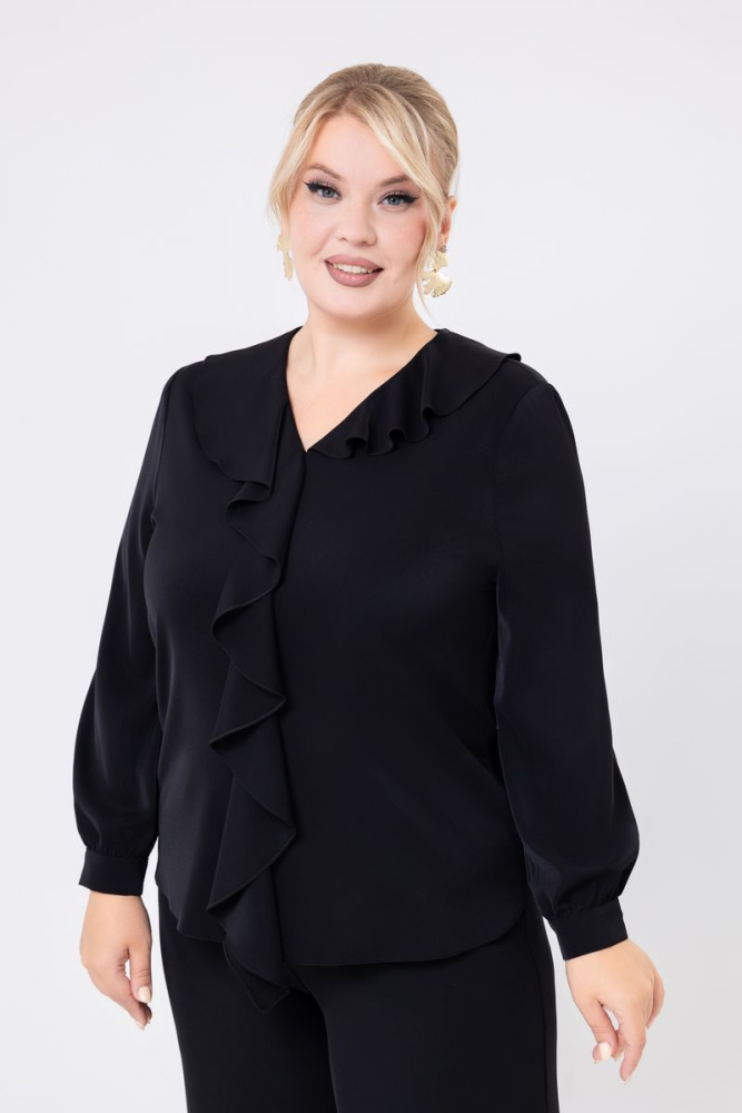 Модель полуприлегающего силуэта, выполнена из ткани «Bali». Горловина V-образной формы дополнена воланом. Рукав втачной, длиный. Низ рукава обработан притачной манжетой со сборкой. Низ изделия фигурный. В боковых швах разрезы.