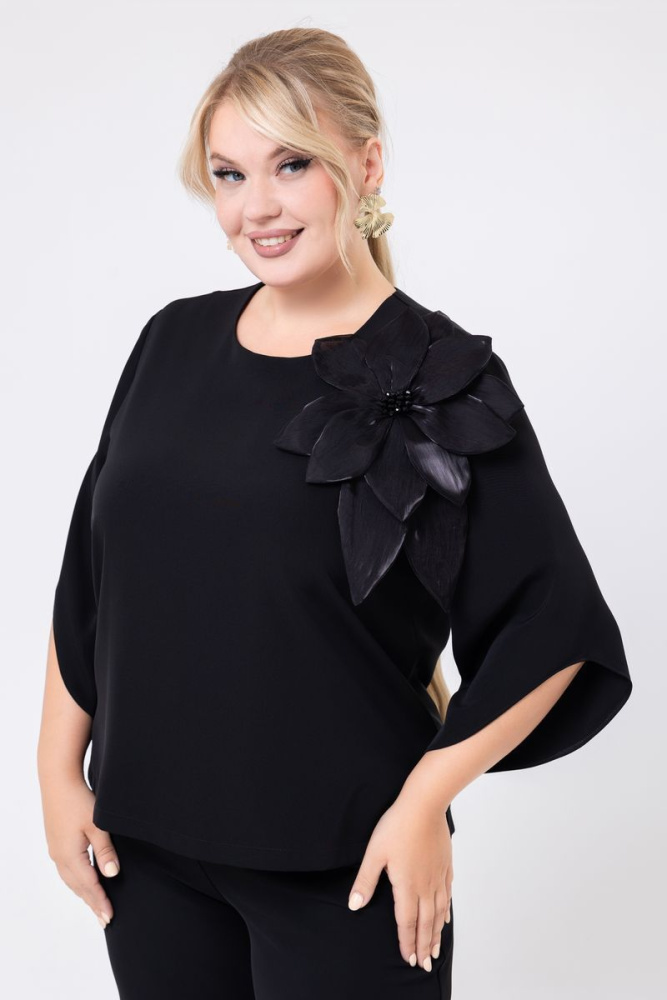 Блуза прямого силуэта, выполнена из ткани «Versace». Вырез горловины круглый. Рукав втачной, длина за локоть. Низ рукава фигурный. В боковых швах внизу разрезы. По спинке средний шов. Изделие дополнено съемным украшением (цветок).