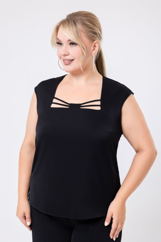 Блузка прилегающего силуэта, выполнена из ткани «Bali». Вырез горловины — каре. Слегка спущена линия плеча. В боковых швах разрезы.