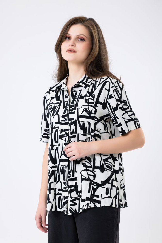 Отложной воротник. Рукав втачной короткий. По центру полочки застёжка на петли и пуговицы. Имеется действующий карман.