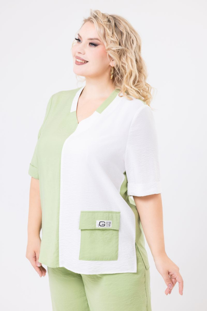Блузон прямого силуэта выполнен из двух видов ткани « Queen moka» + Каролина крэш. V - образный вырез горловины. Рукав втачной, на манжете. Длина до локтя. По полочке рабочий карман. В боковых швах, внизу, разрезы.