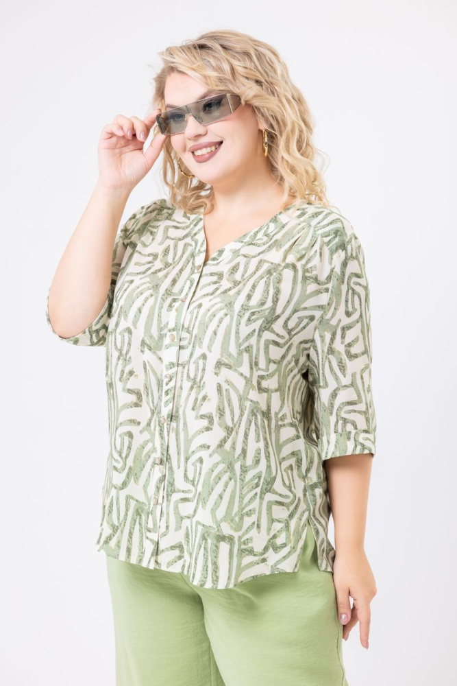 V- образный вырез горловины Рукав втачной, короткий, низ на притачной манжете. По центру полочки застёжка на петли и пуговицы. В боковых швах разрезы.