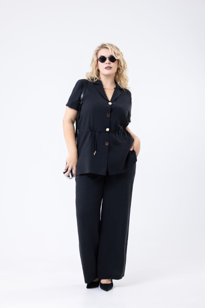 Жакет прямого силуэта выполнен из ткани «Queen-тока». Пиджачный воротник. Рукава втачные короткие, длина до локтя. По линии талии «кулиска». По центру застёжка на пуговицы. В боковых швах внизу разрезы.
