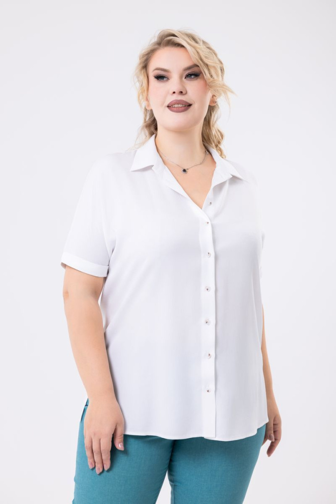 Блузка прямого силуэта выполнена из ткани «Belmando». Воротник отложной. Спущенная линия плеча. Рукав короткий, низ на манжете. По центру застёжка на петли и пуговицы. В боковых швах округлые разрезы.