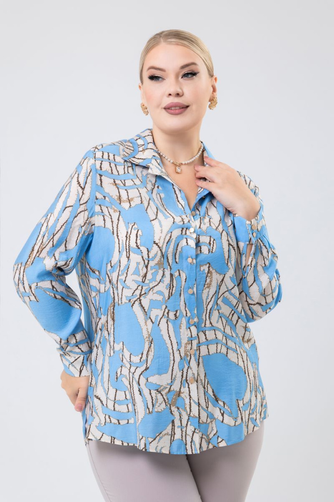 Модель полуприлегающего силуэта выполнена из блузочной ткани. Рубашечный воротник. Рукава втачные, длинные, на манжете. По центру застёжка на пуговицы. В боковых швах внизу разрезы. По спинке — «кокетка».