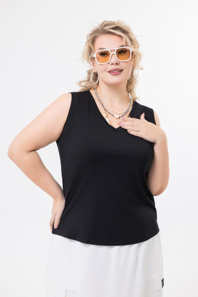 Топ прямого силуэта выполнен из ткани «Модал». Вырезгорловины V-образный. По спинке средний шов.