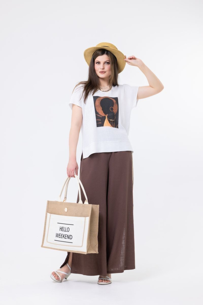 Модель прямого силуэта выполнена из льняной ткани. Вырез горловины — круглый. Спущенная линия плеча. По центру полочки — печать. Низ изделия на манжете. По спинке декоративная застёжка на пуговицы. В боковых швах — разрезы.