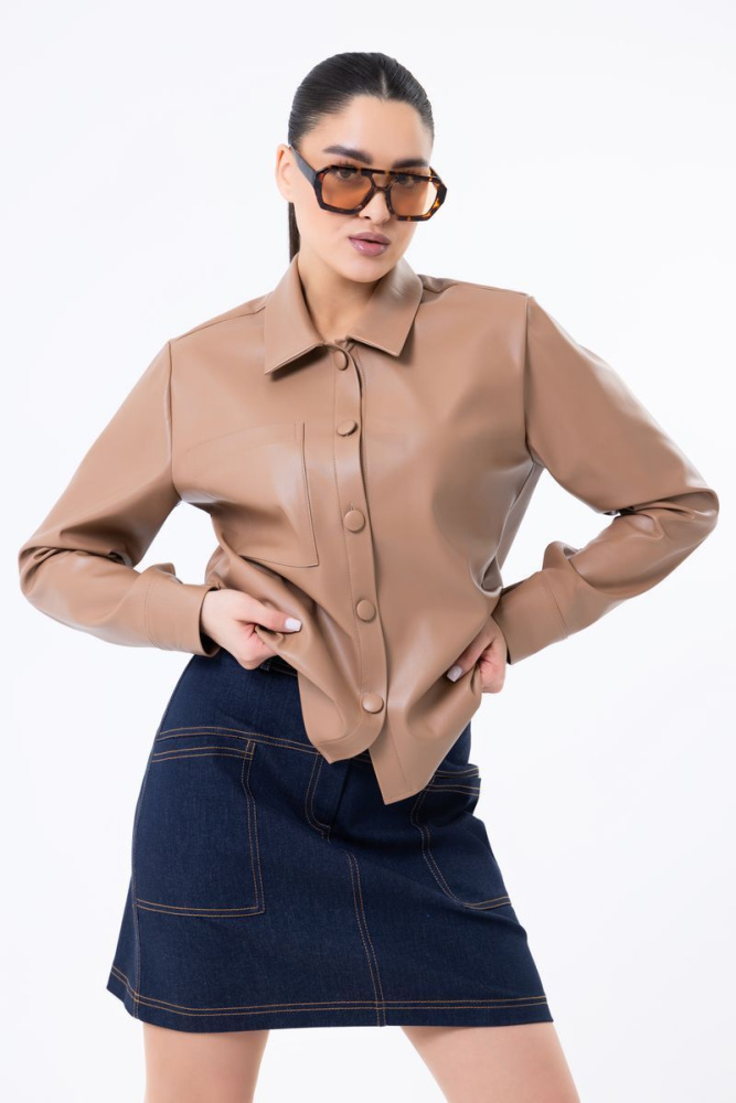 Модель прямого силуэта выполнена из экокожи. Воротник отложной. Рукав втачной, длинный, на манжете. По центру застёжка на пуговицы. По полочке действующий карман.