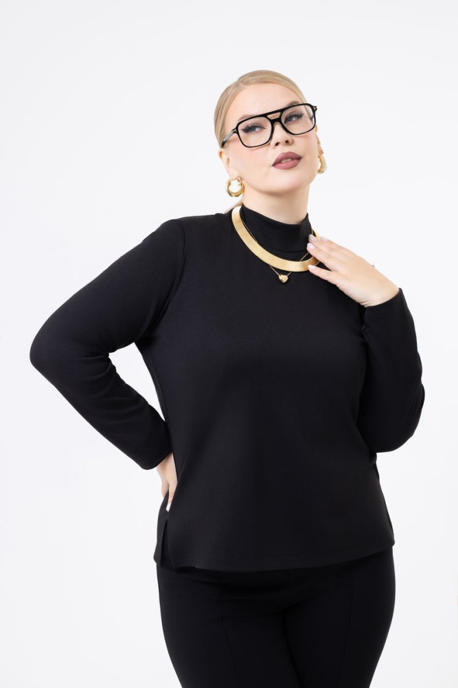 Лонгслив полуприлегающего силуэта выполнен из трикотажного полотна. Воротник стойка. Рукав втачной, длинный. В боковых швах — разрезы.