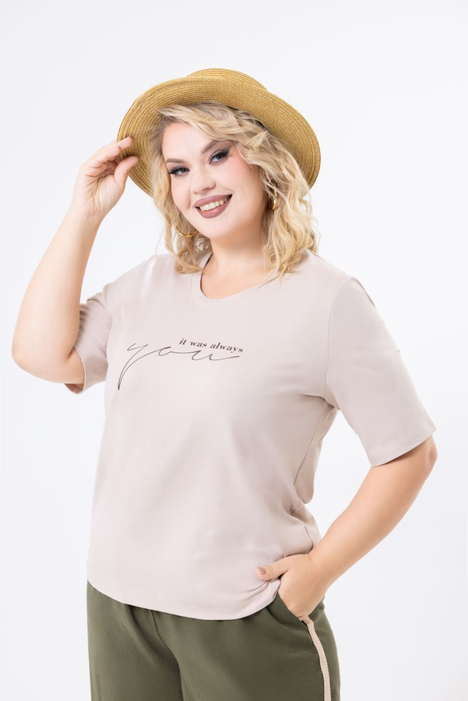Модель прямого силуэта выполнена из трикотажного полотна. Вырез горловины круглый. Рукав втачной короткий. По полочке — печать.