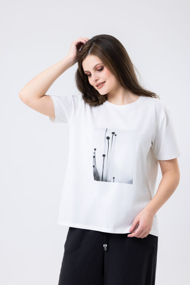 Футболка прямого силуэта выполнена из трикотажного полотна «Кулирка». Вырез горловины круглый. Слегка спущенная линия плеча. Рукав втачной короткий. По полочке печать.
